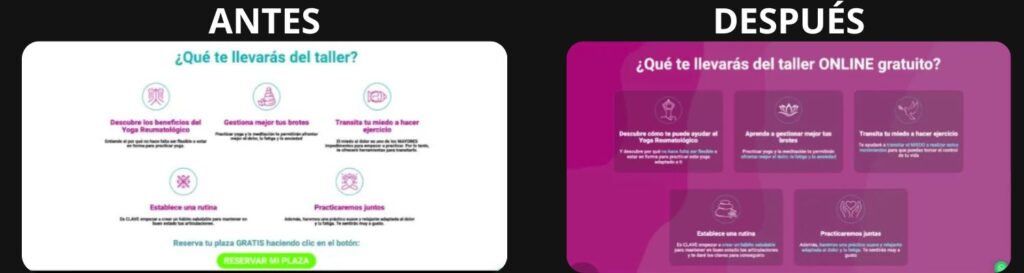 - Incorporación de clases prácticas: Añadimos una sesión práctica de yoga adaptado dentro del webinar, permitiendo que las personas experimentaran por sí mismas los beneficios de este tipo de yoga. Esto rompió una objeción importante: el miedo de su público a no poder practicar yoga debido a sus limitaciones físicas.